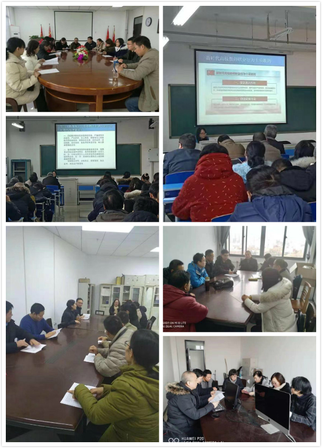 为深入贯彻习近平新时代中国特色社会主义思想和党的十九大精神,深入贯彻落实全国教育大会精神,进一步加强师德师风建设,12月11日下午,YABO鸭脖官网按照学校的要求,组织全体教师在3号组团A906集体学习教育部《新时代高校教师职业行为十项准则》(以下简称《准则》)和《高校教师师德失范行为处理的指导意见》(以下简称《意见》)。