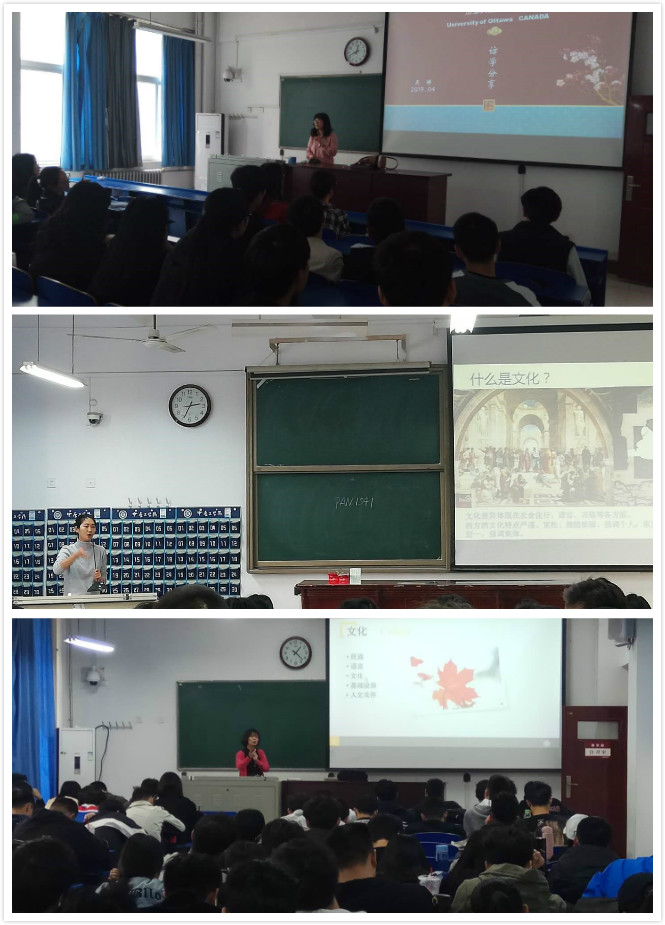 讲座中,四位老师分别就自己的加拿大访学经历向同学们分享了中加的文化差异,为同学们揭开了加拿大异域风情的神秘面纱。加拿大在人文传统、风俗习惯、思维方式、行为准则、生活方式、学习气氛、教育理念等各个方面都与中国不尽相同,特别是加拿大相对宽松的环境、灵活的教学模式,激发学生求知欲方面可以为我们学习和借鉴。几位老师在加访学期间,主动承担起了中国文化对外传播的使命,把我国文化的博大精深、领先技术等进行了随时随地的传播和讲解,使外国人能够更加了解中国、喜欢中国,为促进中加文化交流贡献了力量。