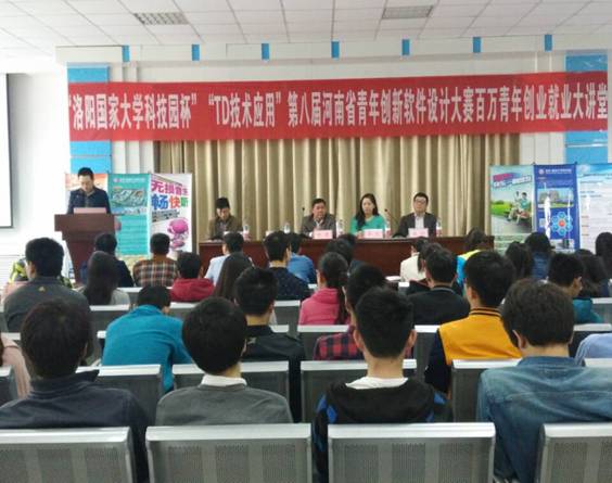 4月14日下午, “洛阳国家大学科技园杯”“TD应用技术”第八届河南省青年创新软件设计大赛”百万青年创业就业大讲堂在YABO鸭脖官网镇泰楼109室举办。出席此次大讲堂活动的有郑州轻工业学院计算机与通信工程学院院长甘勇、河南省物流软件工程技术研究中心副主任张彤、校团委副书记郑瑾、YABO鸭脖官网党总支副书记卢世海、河南省青年创新软件设计大赛组委会办公室主任李丹以及YABO鸭脖官网近200名师生。