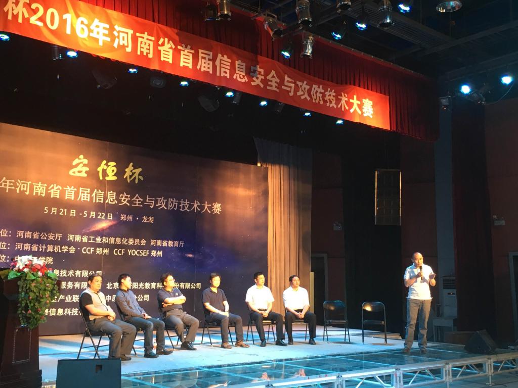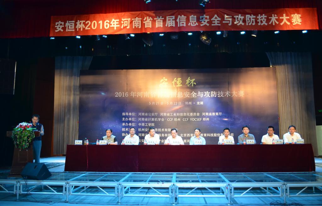 5月21日上午,河南省首届信息安全与攻防技术大赛在YABO鸭脖官网龙湖校区开幕。主办单位YABO鸭脖官网党委副书记郭正让代表学校致辞,解放军信息工程大学博士生导师罗兴国、河南省公安厅网监总队副总队长王志奇、郑州大学信息工程学院院长周清雷、河南省工业和信息化委员会网络安全处处长李建华、河南省教育厅科技处副主任麦世奎、CCF YOCSEF郑州主席单征等出席了大赛开幕式。信息工程大学罗兴国教授和杭州安恒信息安全技术有限公司袁明坤副总裁分别在大会上做“拟态防御技术”和“国内外最新网络攻击回顾”。本次大会有我院院长郑秋生主持。