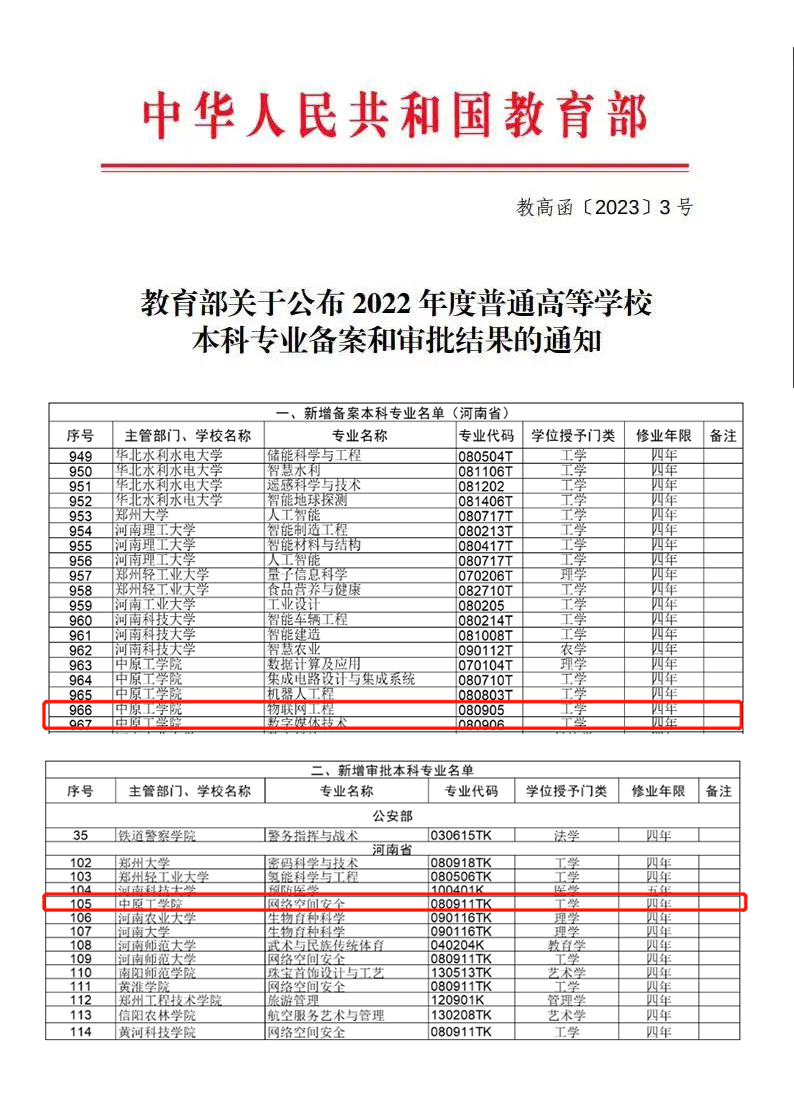 近日,教育部发布《2022年度普通高等学校本科专业备案和审批结果》(教高函〔2023〕3号),我院物联网工程、数字媒体技术、网络空间安全3个新申报专业成功获批。