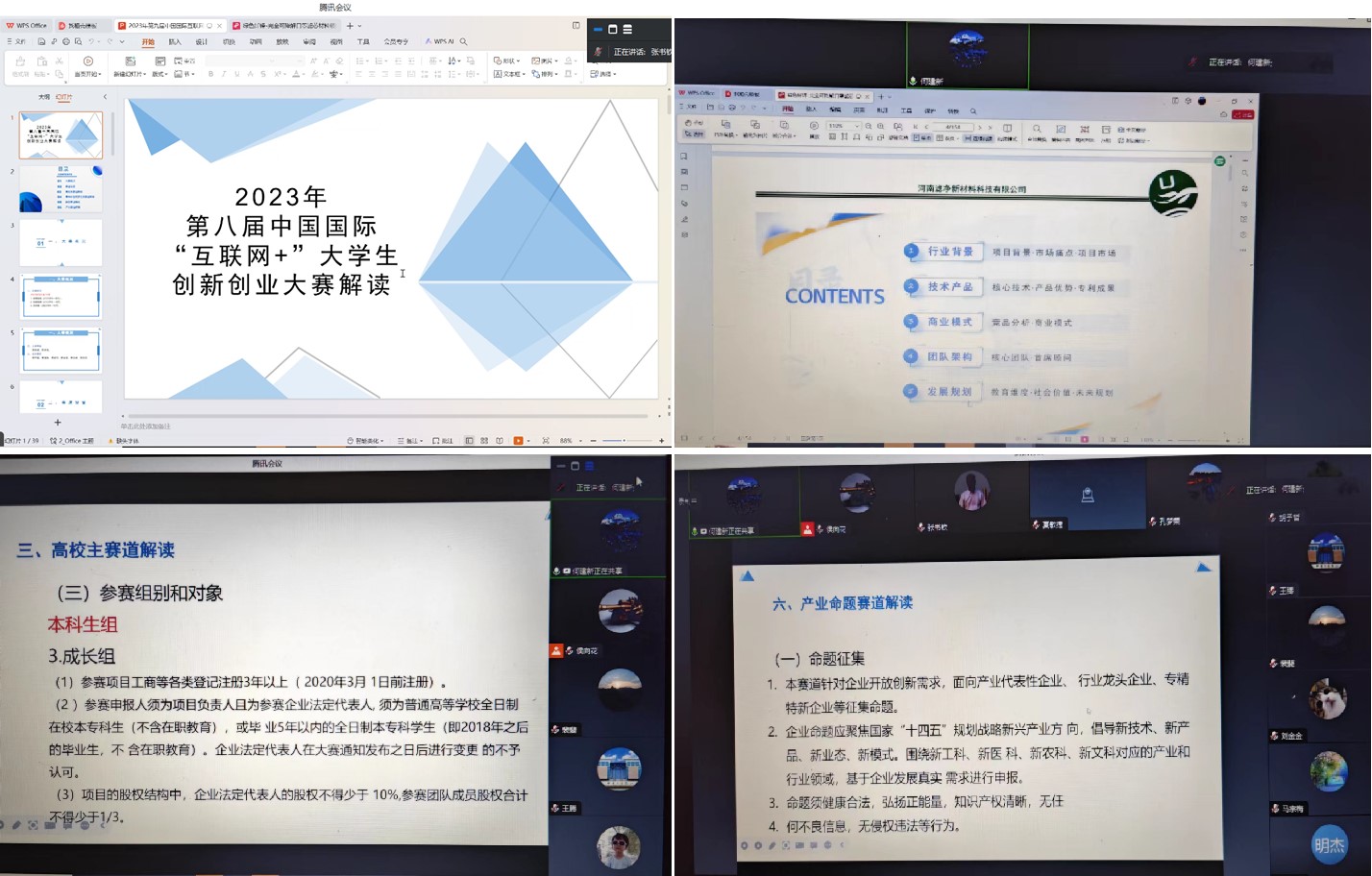 何建新教授依据个人多年大赛指导经验,结合2023年第八届中国国际“互联网+”创新创业大赛参赛情况,介绍大赛赛事规则,详解“互联网+”赛道设置及评审重点。何教授以其指导的获奖作品为例,讲解分析了参赛项目的选题、培育、亮点打造、核心竞争力提升等内容,分享了创业计划书撰写、PPT汇报的经验与感悟,鼓励教师们在指导学生参赛时瞄准新工科方向发力,并对及早着手培育、注重成果积累、强化团队协作、持之以恒努力、不断打磨作品等方面提出中肯建议。