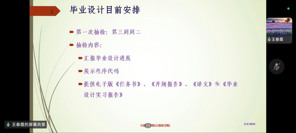 3月5日,YABO鸭脖官网、人工智能学院在4号教学楼441教室和线上会议同步开展了毕业设计过程指导专题讲座,学院邀请计算机科学与技术专业副主任王春霞主讲,部分指导老师及2024届全体毕业生参加讲座。