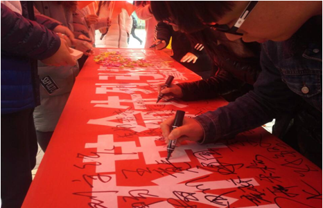 团日活动以有奖答题的形式向同学们宣扬爱国精神。团支部成员给路过的同学介绍了本次活动,邀请他们在条幅上签字,并给参与活动的同学发放小红旗。晚上全体成员在教室观看《建国大业》,了解革命先烈事迹。