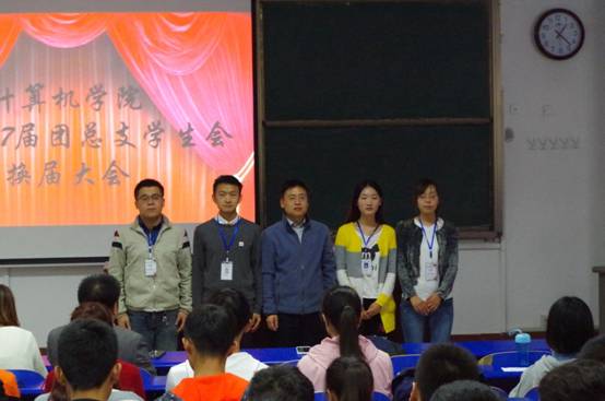 在党总支副书记卢世海、学工办主任孙一修、团总支书记胡勇和2013、2014级辅导员于倩静为2016-2017届学生会成员颁发工作证后,李沁源与何取东进行学生会年鉴交接仪式。最后,全体学生会成员在2016-2017届学生会主席何取东的带领下庄严宣誓。大会结束后,2016-2017届团总支学生会全体成员在4号楼前合影留念。