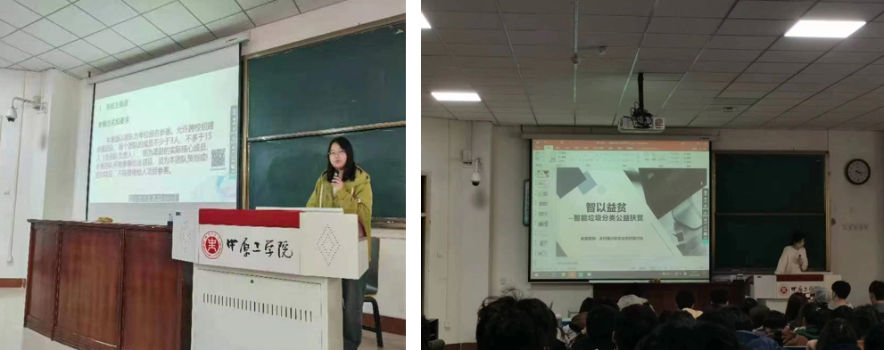 首先由学院上届团委副书记肖一凡同学就“互联网+”大学生创新创业大赛的赛道类别、参赛材料准备、赛事流程、相关奖励等展开了详细讲解,接下来是2022年挑战杯省赛三等奖项目团队负责人苏雪,结合其团队获奖作品——《智以益贫——智能垃圾分类公益扶贫》项目进行讲解,同时分享了参与创新创业竞赛的体会收获,并鼓励大家多多尝试、踊跃参与。兼职辅导员冷亚珂对我院“互联网+”赛事进程详述了具体安排,最后侯向花老师为本次动员会做了总结,给大家分享了创新思维、创业实践等多方面经验,鼓励大家高度认知“互联网+”创新创业大赛重要性,高年级科创实践委员做好班级创新创业氛围营造和参赛积极性引领,多方宣传,大力推进,通过赛事提升专业素养、创新实践能力和团队合作精神。后续学院还会组织、参与各级各类创新创业培训,扎实推进学院创新创业工作。