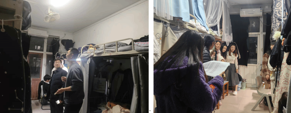 学院分组,学院领导带领师生、党员志愿者检查了学院学生所在的南北苑所有学生宿舍,对环境卫生脏乱差宿舍以及违规吸烟、违规使用大功率电器、人走不断电等潜在风险隐患宿舍进行了通报,要求限期整改,辅导员班主任跟进整改效果及后续复查。