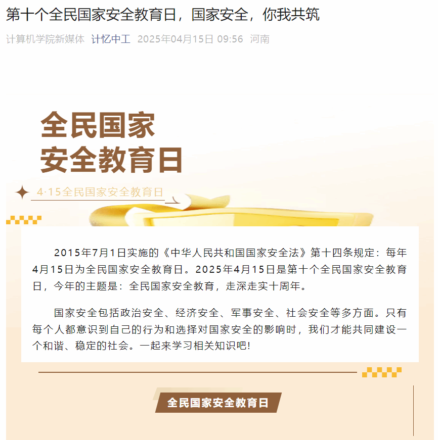 4月15日,学院利用“计忆中工”微信公众号平台,发布了以“全民国家安全教育,走深走实十周年”为主题的推文。推文通过图文并茂的形式,阐述了“什么是国家安全”,“如何维护国家安全”等内容,提升了学生的国家安全意识和法治素养。、