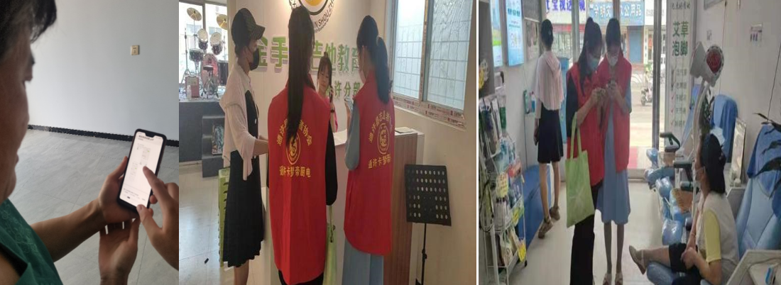 7.13-7.15日杨赫、代旭、侯安琪等人到各地进行教导居民使用一些与地方新冠疫情有关的常用app和在地方作为志愿者进行服务或采访调查。如自己制作微信基本使用说明,在小区常态化核酸检测以及超市这种中老年人需要使用微信扫码的地方宣传使用说明;为老年人讲解如何正确使用健康码、行程卡、场所码等并为老年人推荐国家反诈中心APP,提高老年人的防诈意识;进入乡镇进行实践调查,进行法律咨询活动和入户调查等活动。