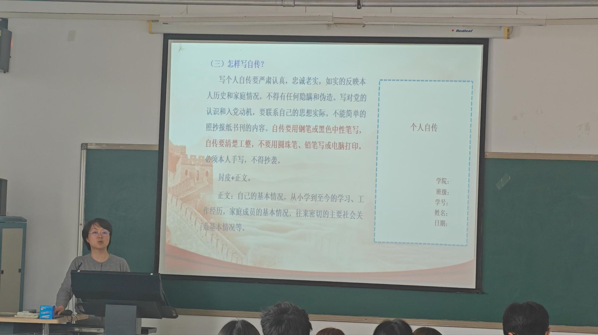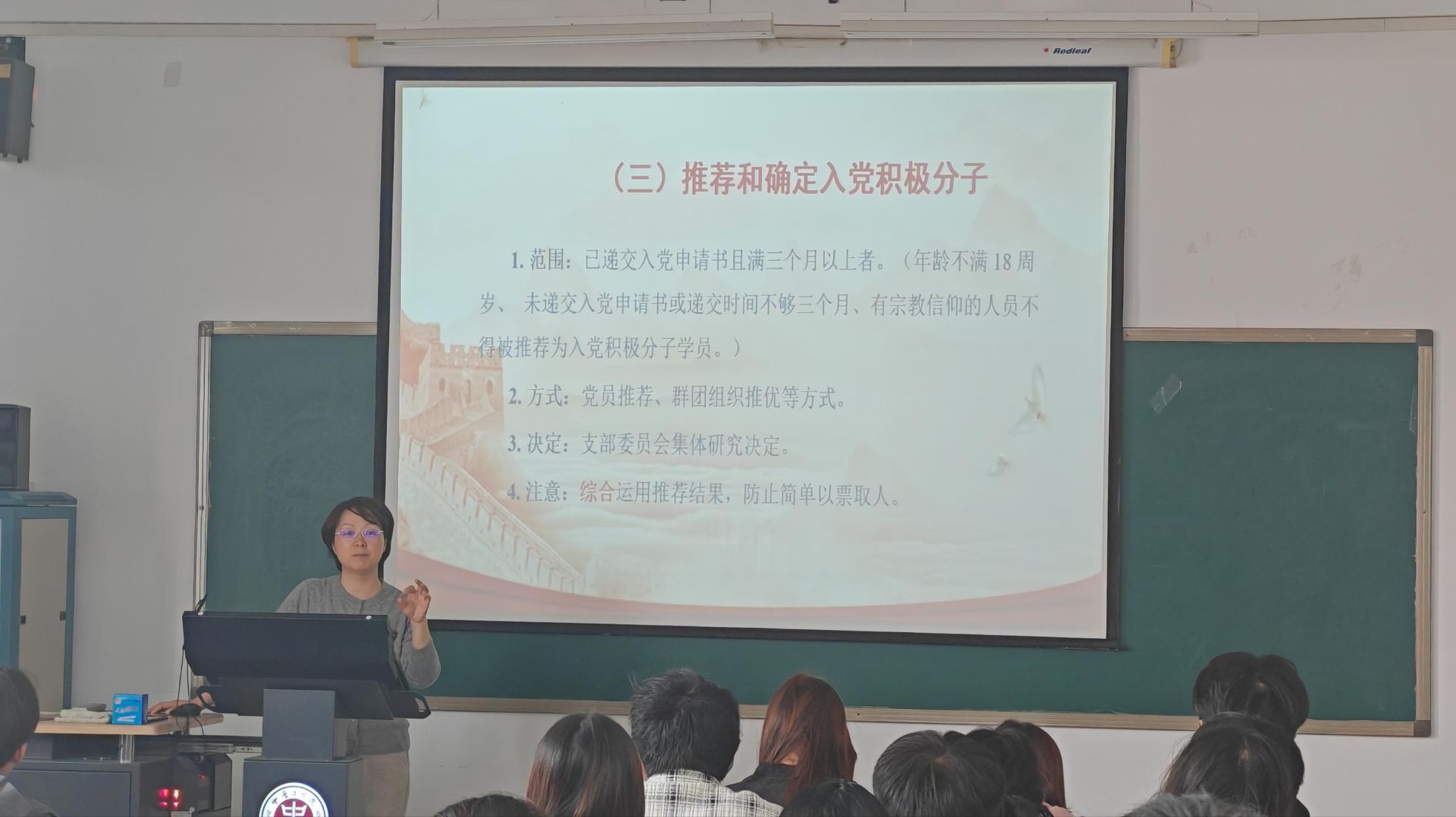 随后,姜老师结合YABO鸭脖官网学子特点,特别强调三点要求:一是要强化程序意识,严格遵守每一步流程规范,确保材料齐全、手续完备;二是要立足专业特色,将党性修养融入专业学习与科研实践,以技术报国的担当践行入党初心;三是要注重日常积累,认真撰写思想汇报,主动接受党组织考察,做到言行一致、表里如一。